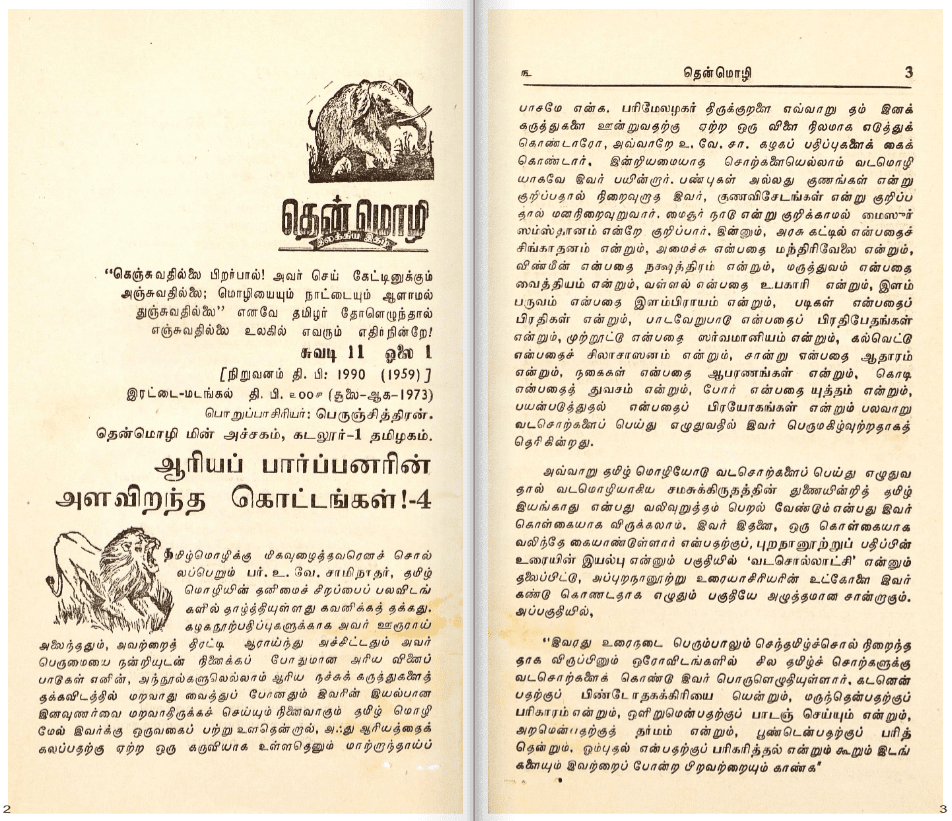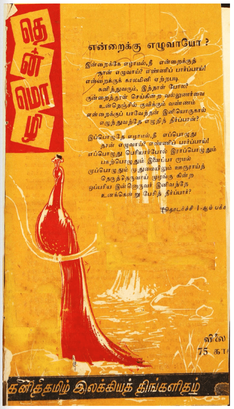 தமிழ்ப்பற்றும் தமிழ் உணர்வும் கொண்டு தம் பா இயற்றும் ஆற்றலால் இதழை நடத்திய பெருஞ்சித்திரனார், அக்காலத்தில் சுடர் விட்டு எழுந்த இந்தி எதிர்ப்புப் போரில்தம் உரையாலும் பாட்டாலும் பெரும் பங்காற்றினார். இந்தி எதிர்ப்புப் போரில் இவர்தம் தென்மொழி இதழிற்குப் பெரும் பங்குண்டு. இவர் எழுதிய பாடல்களும் கட்டுரைகளும் இந்தி எதிர்ப்பு உணர்வைத் தூண்டுவதாக அரசால் குற்றம் சாற்றப்பெற்றது. இவருக்கு இதனால் சிறைத் தண்டனை கிடைத்தது. சிறைசென்றதால் அரசுப்பணியிலிருந்து நீக்கம் செய்யப்பெற்றார்.. எனவே, முழுநேரமாக இயக்கப் பணியாற்றினார். சிறையில் இருந்தபோது ஐயை என்னும் தனித்தமிழ்ப் பாவியத்தின் முதல் தொகுதியை எழுதினார். சிறையில் இருந்து வெளிவந்த, பிறகு மாணவர்கள் படித்துப் பயன்பெறும் வண்ணம் தமிழ்ச்சிட்டு என்னும் இதழைத் தொடங்கினார். இவ்விதழில் பள்ளிகளில் படிக்கும் மாணவர்கள் விரும்பும் வண்ணம் பாடல்களையும் கட்டுரைகளையும் வரைந்தார். தம்மை ஒத்த பாவலர்களின் படைப்புகளையும் வெளியிட்டு ஊக்கப்படுத்தினார்.